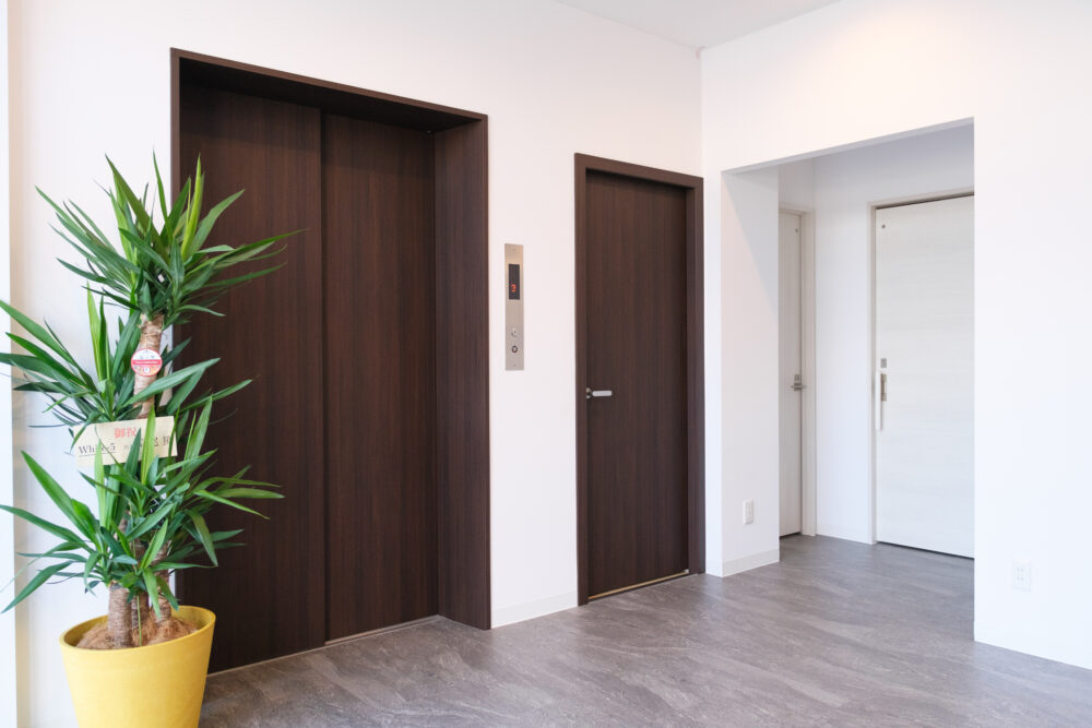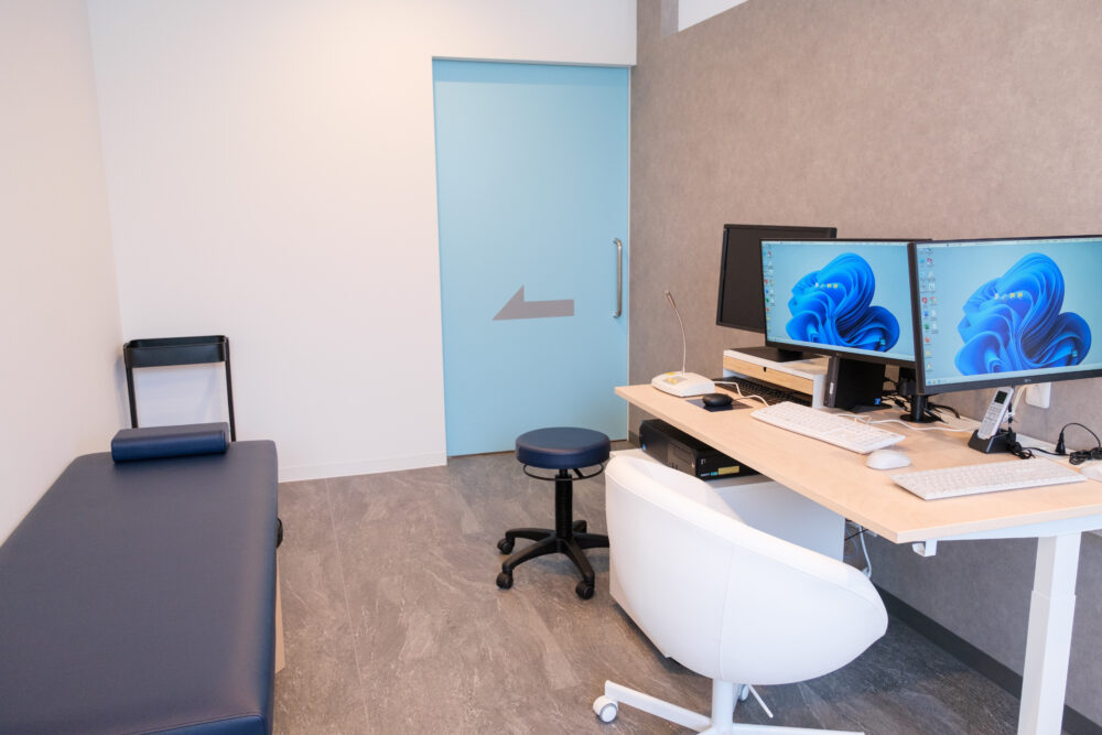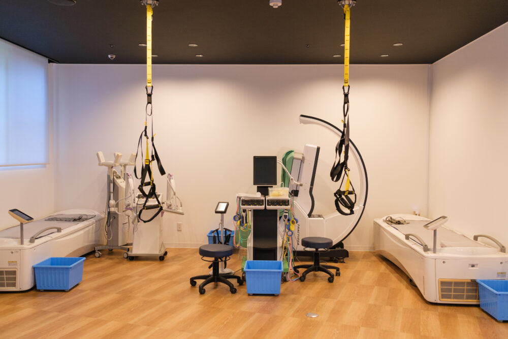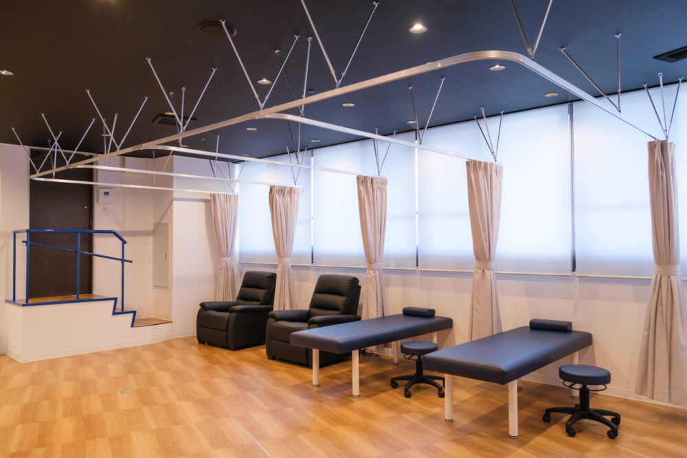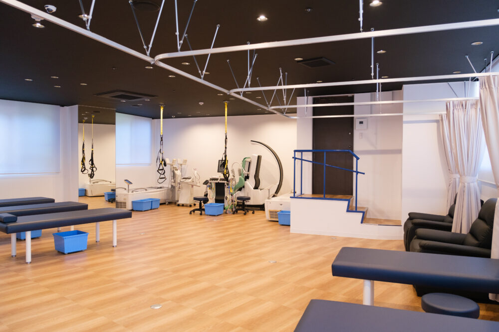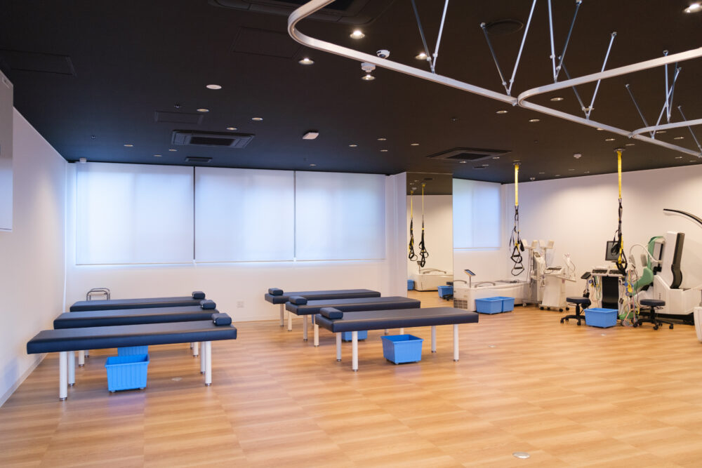 広いリハビリ室は黒天井と連続レールでフレキシブルに使える構成にしました。