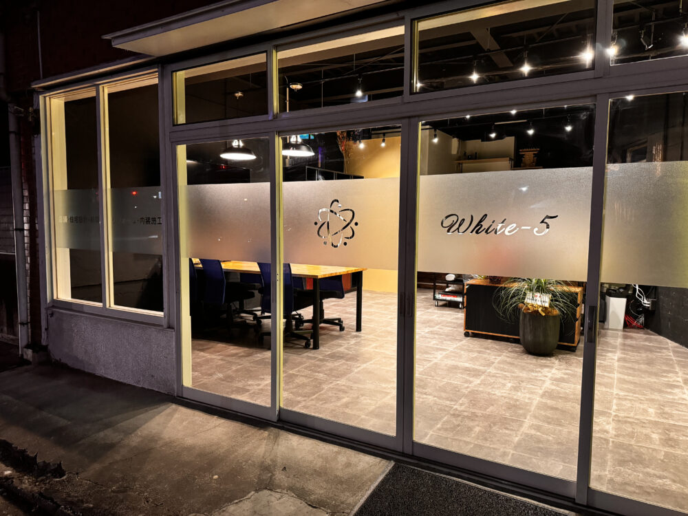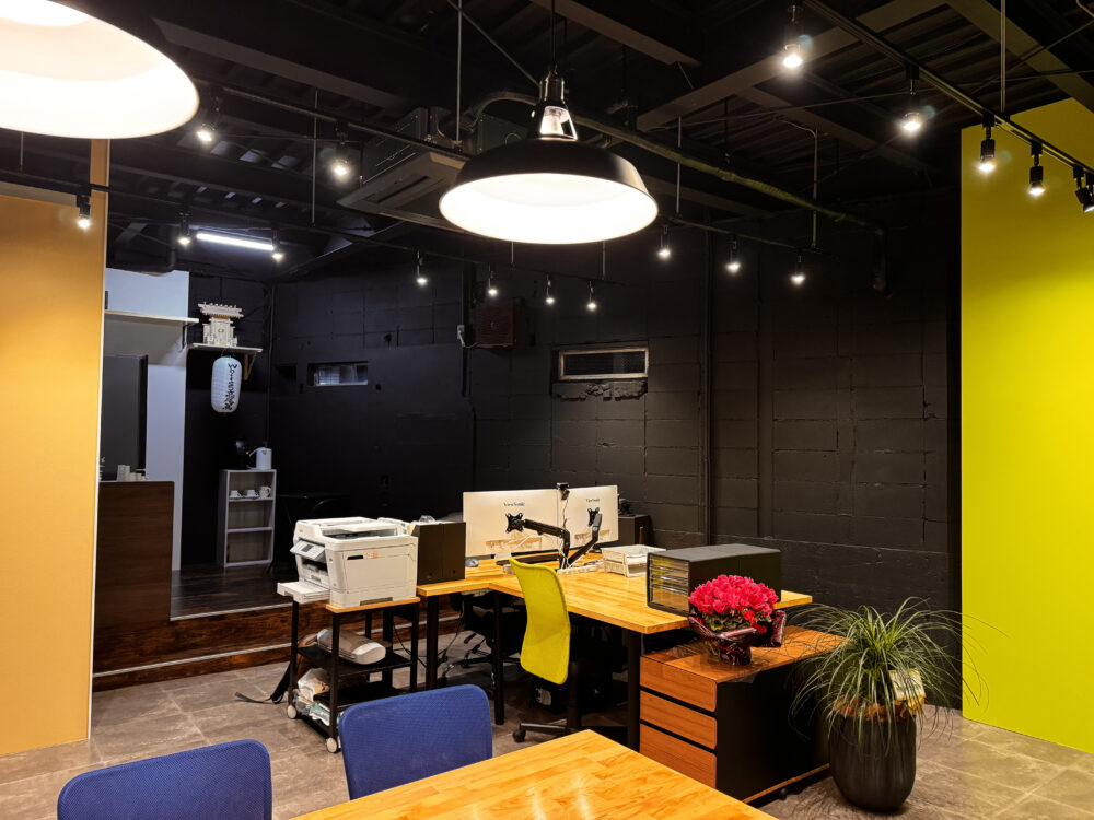 黒天井とライティングレールで開放感のある天井表情を活かし、木天板のデスクとグリーンで温かみを加え窓面のロゴガラスでブランドを印象づけました。