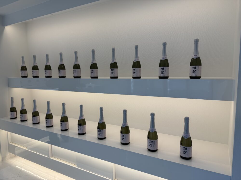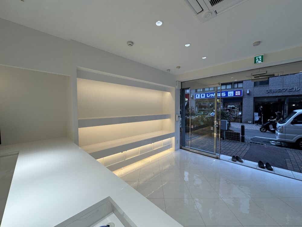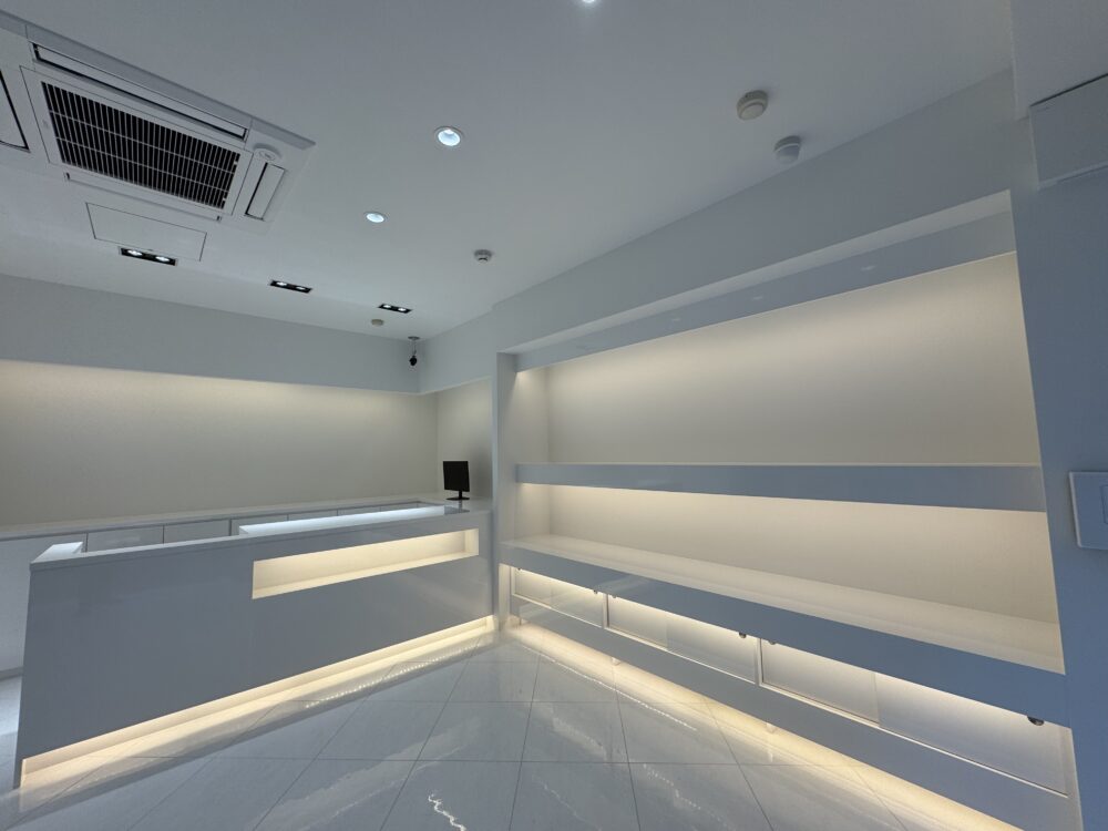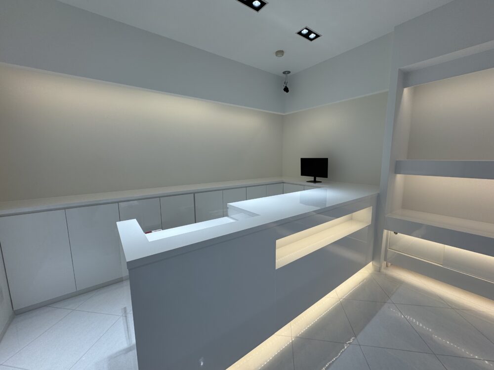 白で統一したギャラリーのような店内で、カウンターと壁面什器に組み込んだ光が商品を主役に引き立てます。